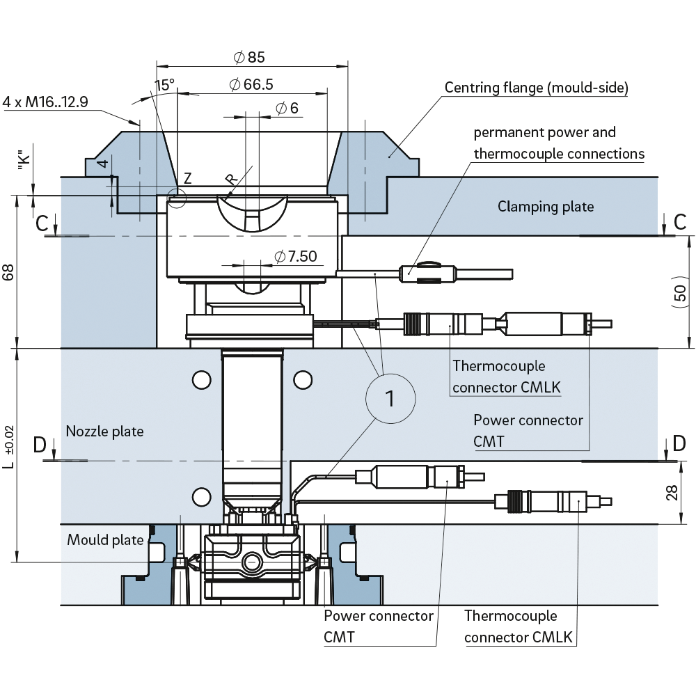 多点热流道喷嘴线性版本,用于侧面进浇,带加热适配器