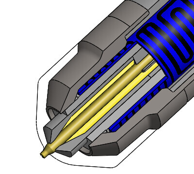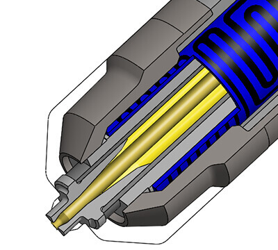 针阀导套和优化针阀的创新设计实现极低磨损运行。在关闭动作中,针阀经锥面引导至圆柱形预定心装置,精确浸入圆柱形注射点。针阀导套以浮动方式支撑在材料管中。